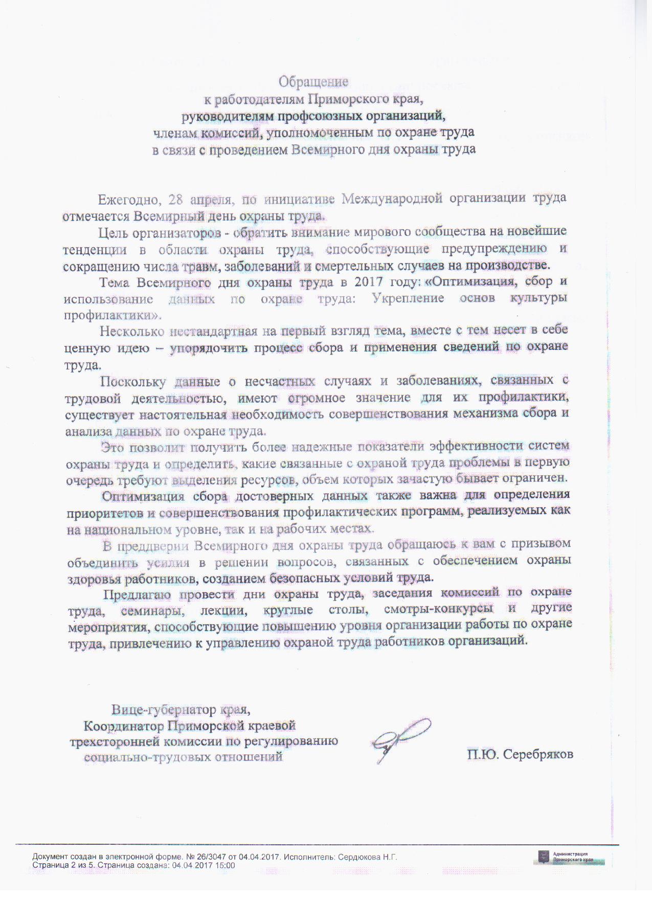 Обращение к руководителям предприятий, организаций, учреждений, работодателям всех форм собственности, руководителям профсоюзных организаций, членам комиссий, уполномоченным по охране труда в связи с проведением Всемирного дня охраны труда